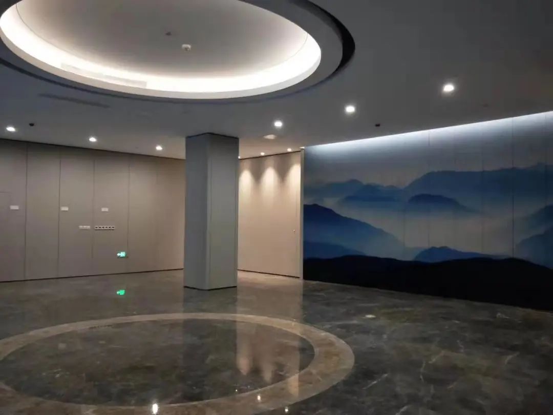 大樓主入口設置了鋁合金除泥墊,保持室內空間的癥結,更具人性化。主入口的背景采用了以“星空下,山水間”為主題的造型墻,把設計概念落實到實處。大廳等候區采用多元化的家具組合形式,讓空間更加生動。