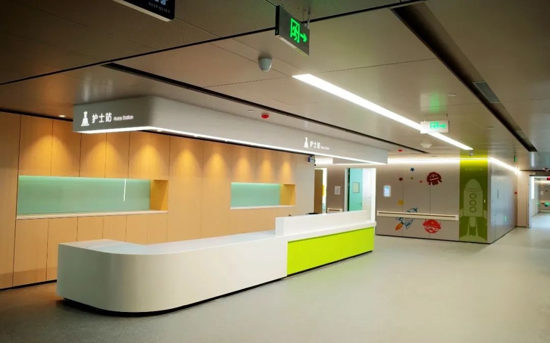 產科病房和兒科病房的墻面一改以往單調的色調,以紅、綠、藍、黃等色彩使室內空間五彩斑斕,兒科病房的墻面印刷上了許多的卡通圖案,使之既色彩豐富,又迎合了產科溫馨、兒科活潑的要求。